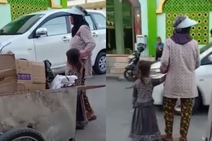 Dalam video unggahan @infobutonraya, tampak seorang ibu dan seorang gadis cilik berdiri di samping gerobak yang dipenuhi sampah kardus.