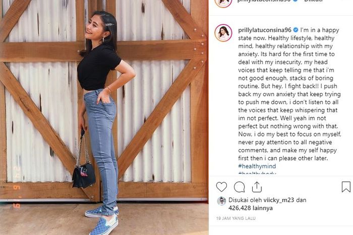 Hal itu terlihat dalam unggahan di Instagram Prilly belum lama ini. Dalam foto tersebut, kekasih Maxime Bouttier itu pose bahagia dengan memakai baju kasual. Ia mengenakan kaus hitam dan celana jeans ketat.