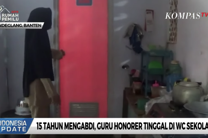 Nining Suryani, guru di SDN Karyabuana 3 Cibaliung, Kabupaten Pandeglang, Banten, terpaksa harus tinggal di toilet sekolah lantaran tidak punya rumah.