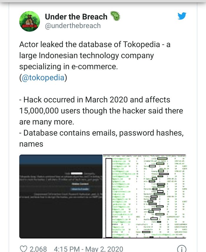 Akun tersebut menyebut sekitar 15 juta data pengguna Tokopedia yang dibagikan di forum gelap itu, di mana data tersebut diperoleh sekitar bulan Maret lalu.
