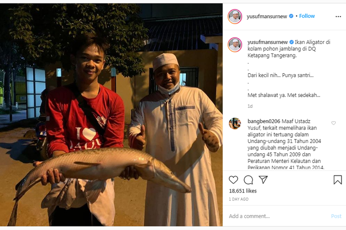Ustaz Yusuf Mansur mengunggah sebuah foto seekor ikan yang tengah dipegang seorang pemuda.