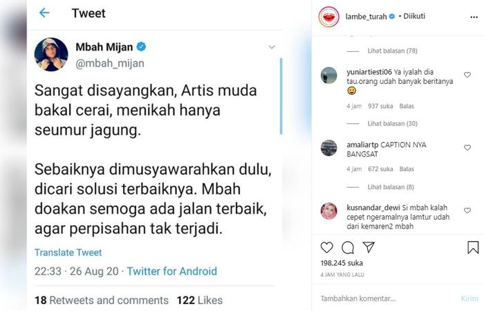 "Sangat disayangkan, Artis muda bakal cerai, menikah hanya seumur jagung," tulis Mbah Mijan