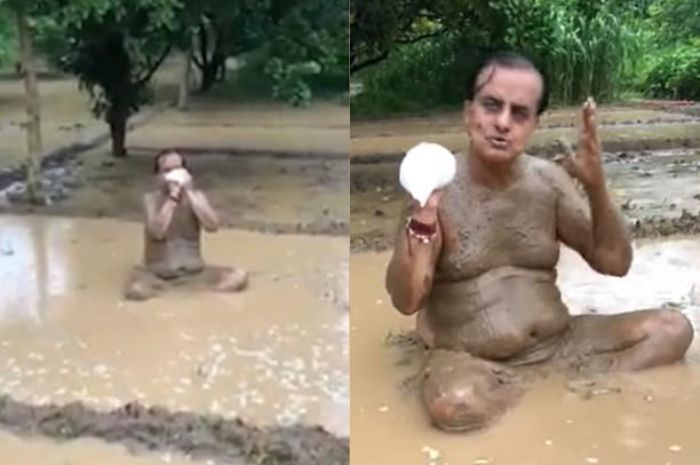 Dalam video itu, terlihat Sukhbir yang bertelanjang dada duduk di genangan lumpur sambil meniup cangkang keong.