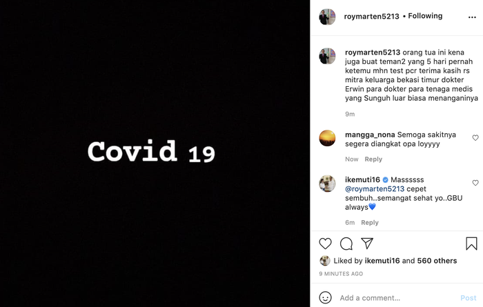 “Massssss @roymarten5213 cepet sembuh, semangat sehat yo. GBU always,” tulis akun ikemuti16.