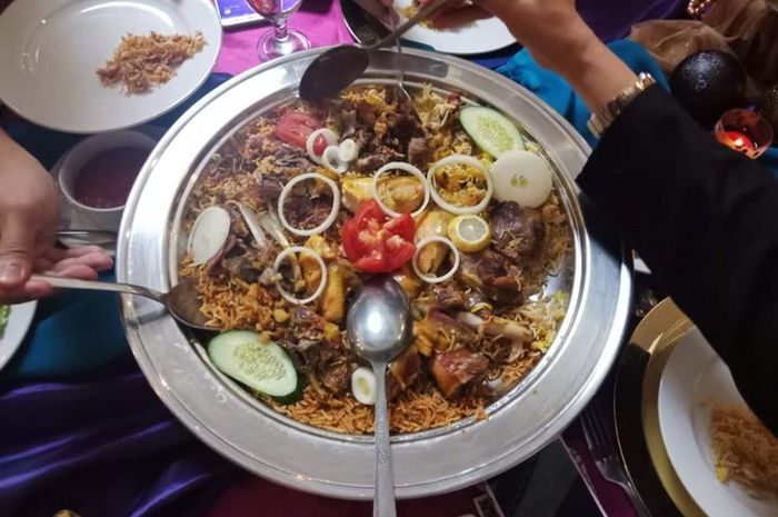 Jika di Indonesia, hidangan machboos mirip dengan nasi kebuli kambing.