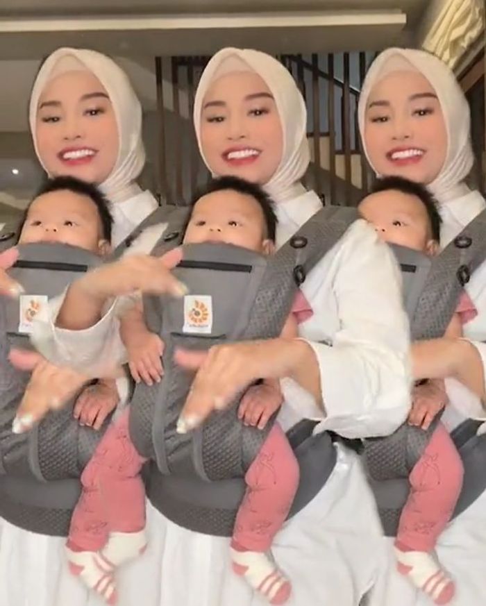 Dalam video tampak seorang wanita memperagakan dan mengedukasi cara pemakaian gendongan bayi yang digunakan Aurel.