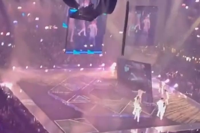 Lantaran tak menyadari jika layar raksasa itu sudah nyaris jatuh, dua orang anggota grup boyband pun tertimpa layar raksasa itu.