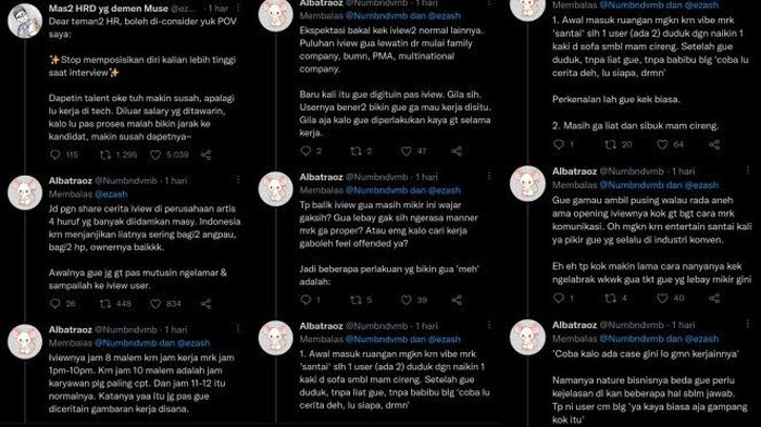“Jadi pengen share cerita interview di perusahaan artis empat huruf yang banyak diidamkan masyarakat. Indonesia karena menjanjikan lihatnya sering bagi-bagi angpau, bagi-bagi HP, ownernya baik,” tulis pengguna Twitter itu mengawali cuitan panjangnya.