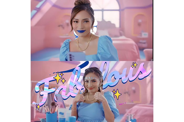 Untuk look terakhir, Rachel tampil lebih ekspresif dengan aksesori cantik berbentuk berlian berwarna biru kristal pada dahinya. Aksesori tersebut dipadukan dengan lipstik merah muda dan eye makeup yang natural sehingga tampilan wajah enggak terlalu “ramai”.
