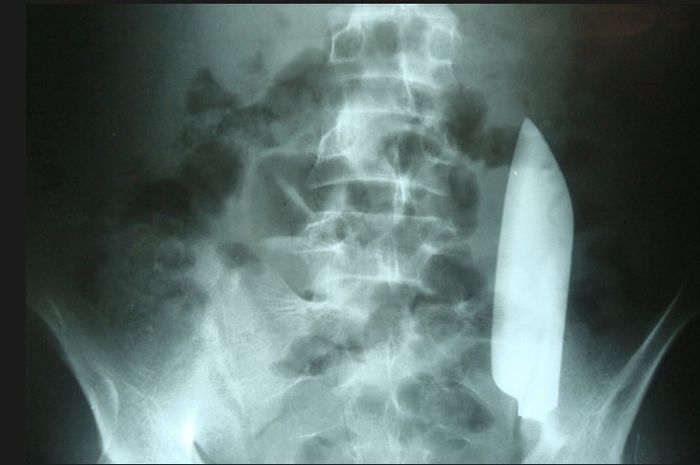 Setelah dilakukan rontgen, dokter kemudian menemukan ada pisau besar masih ada di dalam dan posisinya melintasi perutnya dari sisi kanan ke kiri.