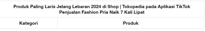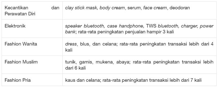 Sedangkan pada platform Shop | Tokopedia di aplikasi TikTok, beberapa kategori produk, yaitu Kecantikan dan Perawatan Diri, Elektronik, Fashion Wanita, Fashion Muslim, serta Fashion Pria, juga mengalami peningkatan transaksi yang sangat tinggi (data 25-31 Maret 2024 dibandingkan rata-rata transaksi mingguan di bulan Februari 2024).