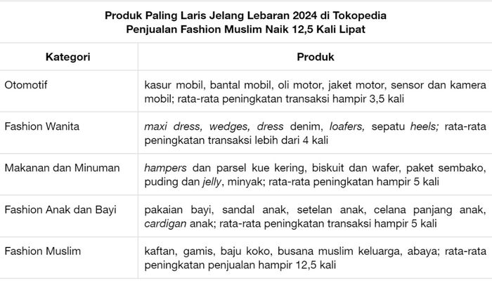 Grid.id - Setelah Tunjangan Hari Raya (THR) Lebaran turun, animo belanja masyarakat dalam berbelanja cenderung meningkat. Di Tokopedia, sejumlah kategori produk, seperti Fashion Muslim, Fashion Wanita, Fashion Anak dan Bayi, Otomotif serta Makanan dan Minuman, mengalami kenaikan penjualan yang signifikan.