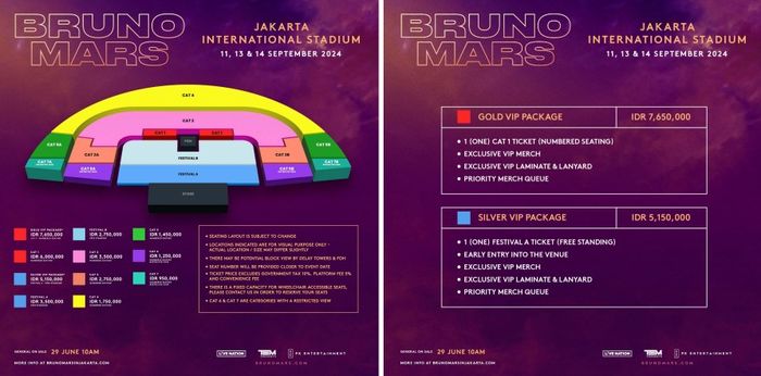 Penjualan Umum untuk ketiga jadwal konser akan dilangsungkan pada hari Sabtu, 29 Juni 2024 mulai pukul 10:00 WIB (Waktu Lokal Jakarta) hanya di brunomarsinjakarta.com.