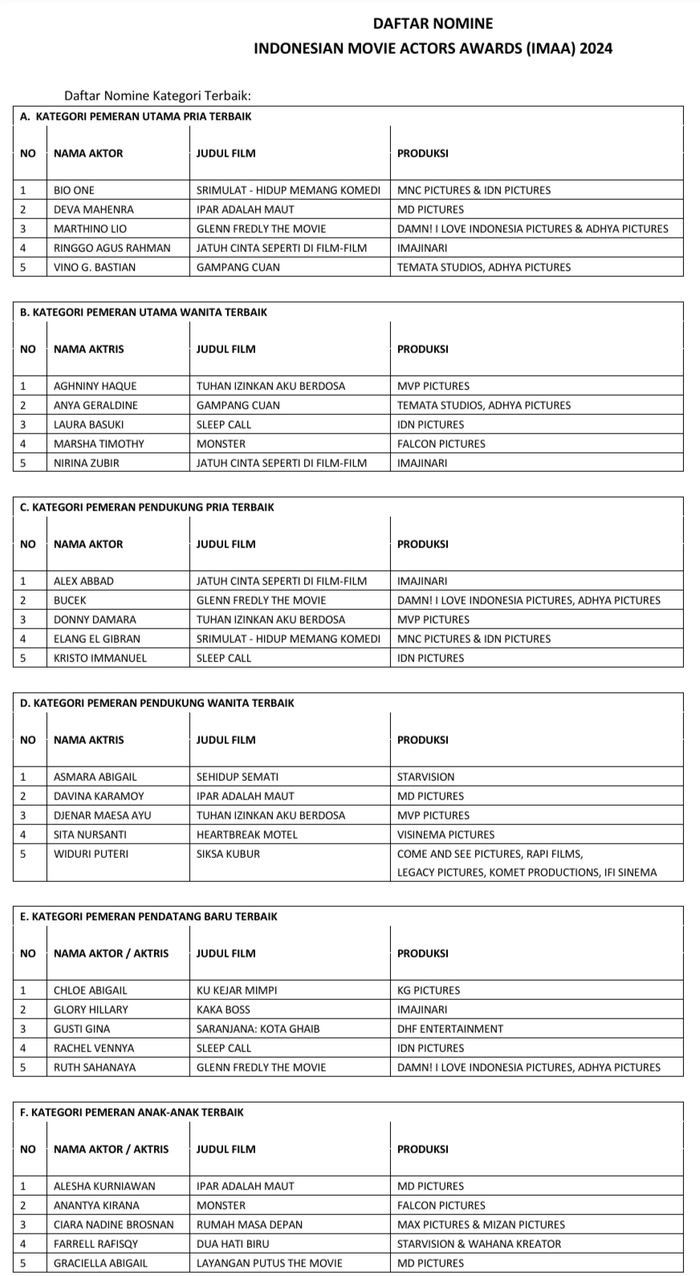 Berikut Nominasi beserta Kategori Indonesian Movie Actors Awards.
