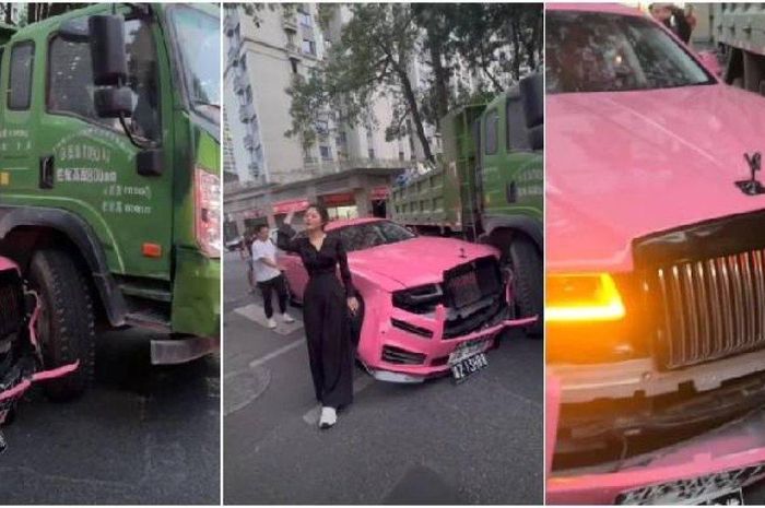 Dimana seorang pengemudi truk di Guangzhou tak sengaja menabrak mobil mewah berwarna pink yang dikendarai sang wanita.