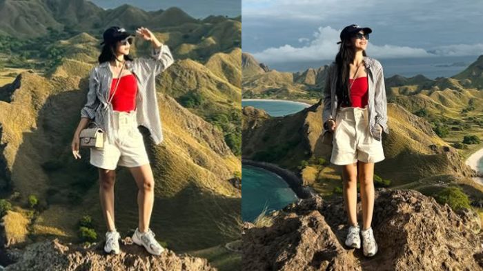 Febby Rastanty juga senang bepergian ke destinasi wisata alam terbuka. Ia terlihat mengenakan strapless top warna merah yang dipadukan dengan kemeja dan celana pendek. Ia juga memakai topi dan sneakers untuk melengkapi penampilannya.