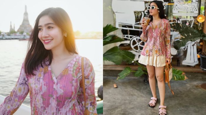 Febby Rastanty baru-baru ini liburan ke Thailand. Ia terlihat memakai setelan santai blouse plisket dan rok mini. Febby Rastanty memadukan dengan sandal berwarna merah muda dan handbag.