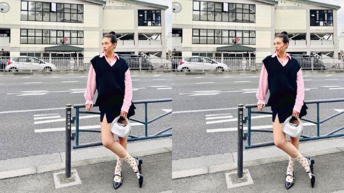 Untuk sepatu, Yuki Kato memilih mengenakan semi flat shoes dan kaos kaki bermotif. Bisa juga kamu padukan dengan sneakers ya.