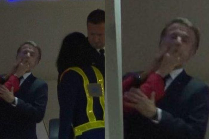 Namun sadar sedang menjadi sorotan, Presiden Perancis Emmanuel Macron langsung bersikap seolah tak terjadi apa-apa dan melambaikan tangan ke awak media.