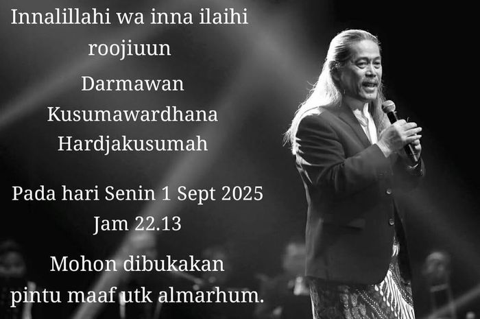 "Innalillahi wa inna ilaihi roojiuun, Darmawan Kusumawardhana Hardjakusumah. Pada hari Senin 1 Sept 2025 jam 22.13. Mohon dibukakan pintu maaf untuk almarhum," demikian bunyi kalimat dalam foto.