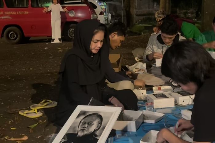 Namun, ada satu pemandangan yang menyita perhatian netizen. Sebuah bingkai foto hitam putih bergambar wajah Epy Kusnandar tampak disandarkan tepat di dekat paha Karina saat ia sedang makan. Seolah ingin menghadirkan sosok sang suami di tengah-tengah mereka, Karina pun menyapa foto tersebut.