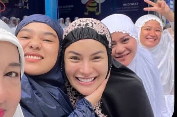 Ia tampak cantik mengenakan mukena warna hitam dengan motif cream. Ibu tiga anak itu juga tampak berpenampilan polos tanpa polesan make up.
