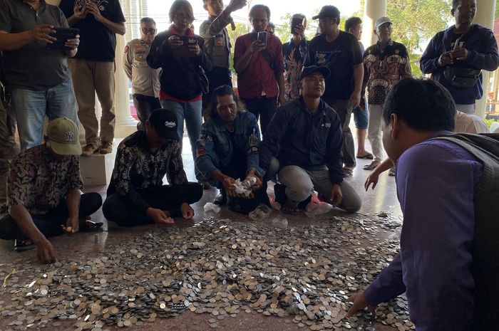 Berdasarkan pantauan di lapangan, para petambak terlihat membawa tiga karung berisi uang koin dengan nominal Rp500 hingga Rp1.000. Total keseluruhan uang yang dibawa belum dapat dipastikan jumlahnya.