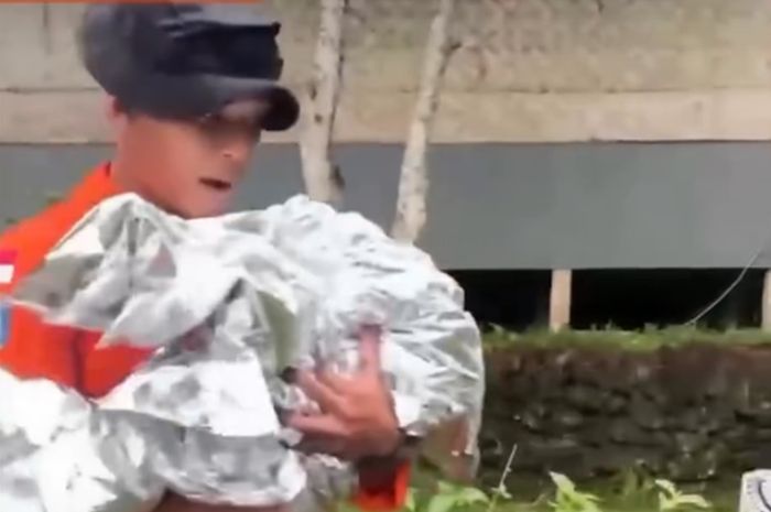 Dalam video yang beredar, tampak petugas SAR yang sedang berusaha menyelamatkan bayi yang dikabarkan mengalami hipotermia. Bayi tersebut digendong oleh petugas dan diselimuti dengan emergency blanket.