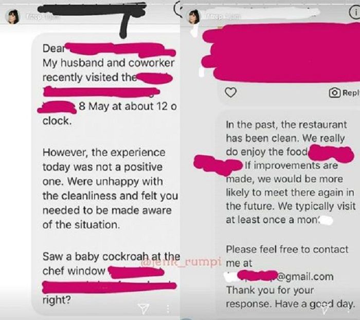 Seakan meyakinkan netizen, Fitrop bahkan mengunggah foto kecoa yang menempel pada kaca resto tersebut.