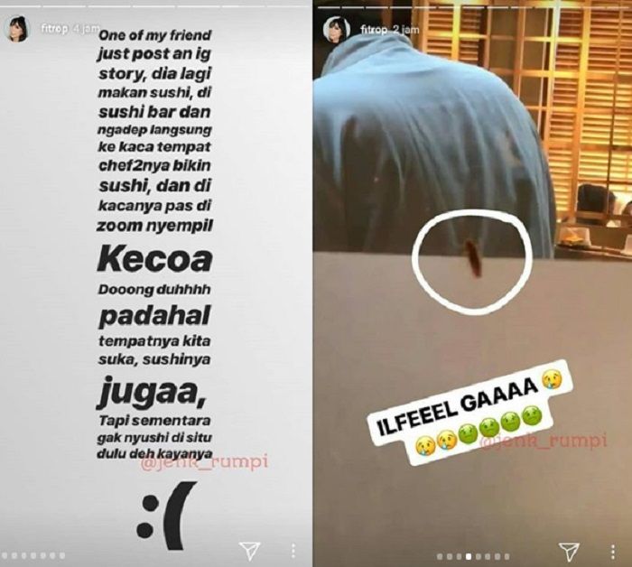 Namun kejadian tak mengenakan terjadi, suami dan teman Fitrop tersebut melihat seekor kecoa pada kaca tempat chefnya membuat Sushi.