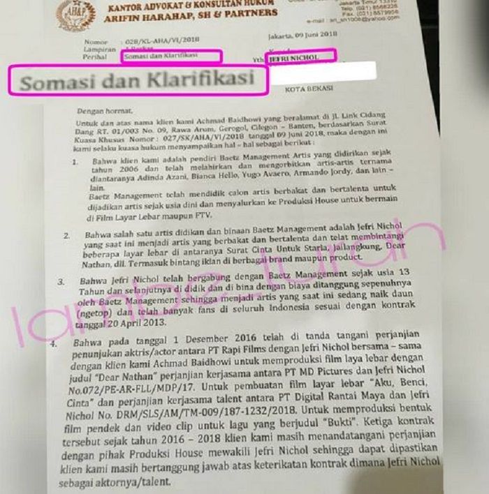 Jefri mendapat sebuah somasi yang ditujukan untuknya.