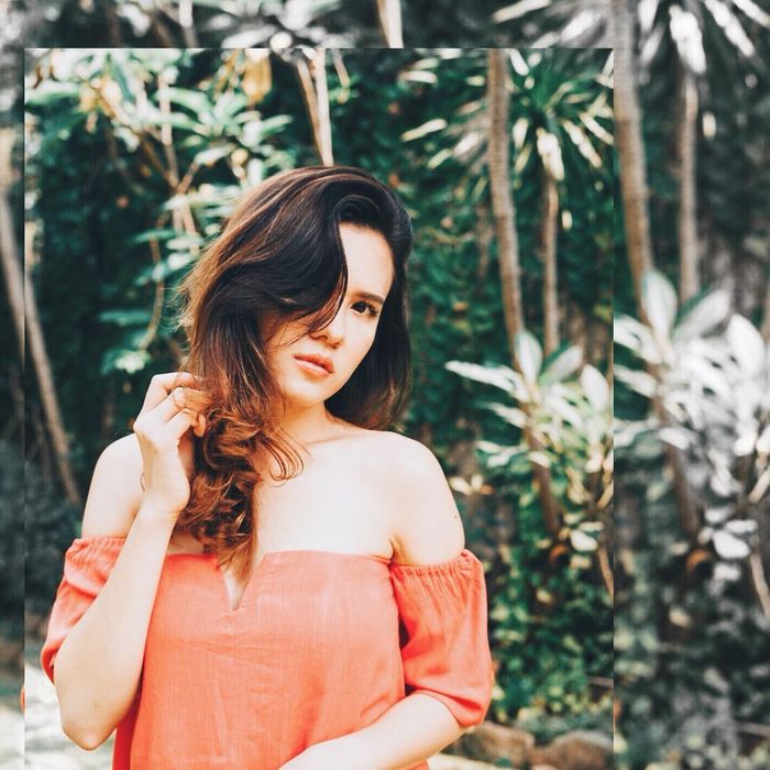 Tampak ia mengenakan jumpsuit berwarna oranye dengan detail off shoulder yang manis.
