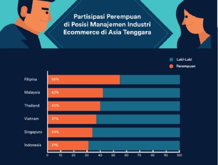 Menurut, Indah Mustikasari, Senior Content Marketer iPrice Group, partisipasi perempuan dalam dewan direksi perusahaan-perusahaan dagang-el RI baru mencapai 31%, lebih rendah dari Filipina (55%), Malaysia (42%), Thailand (40%), Vietnam (37%), dan Singapura (34%).