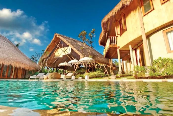 Villa Omah Padi tak hanya dilengkapi dengan area penginapan yang terbuat dari bambu, namun juga menyediakan berbagai fasilitas seperti kolam renang dan area berjemur, dan juga taman.